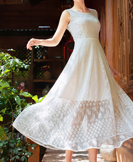 白色典雅蕾丝镂空双层薄纱收身连衣裙,雅典娜般神圣的白色连衣裙被精致的花朵刺绣所包围,辛德瑞拉的水晶凉鞋和小美人鱼的贝壳拎包都让,长裙变得更加梦幻,童话中的公主梦无论何时都是心中的美好愿望,用干净简洁的单品制造纯洁印象。