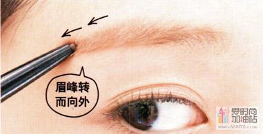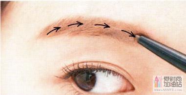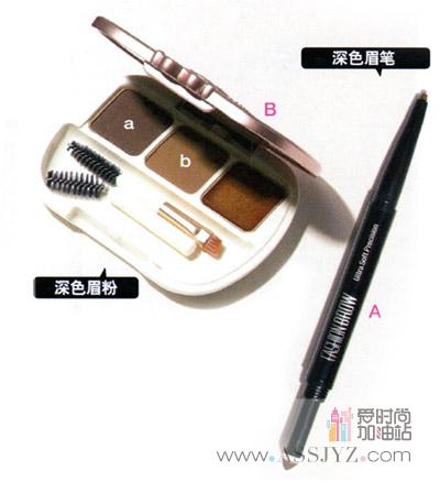用A款眉笔顺着眉尾至眉头方向,在眉上画出线条。从眉尾开始画的话不易上色过深。